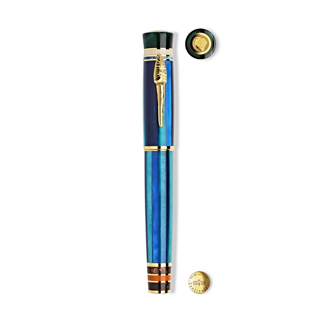 Der in Handarbeit gefertigte Delta Indigenous People Sentinelesi Füllfederhalter ist ein Werk, das aus unzähligen Teilen besteht, die sich in Material, Farbe und Verarbeitung unterscheiden. Die Farben spiegeln die Visionen der Orte wider: Himmel, Meer, Erde, Wald, d.h. alles, was das menschliche Auge sehen kann, wenn es sich der Insel North Sentinel nähert.