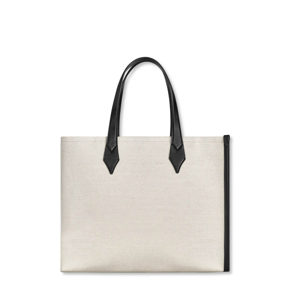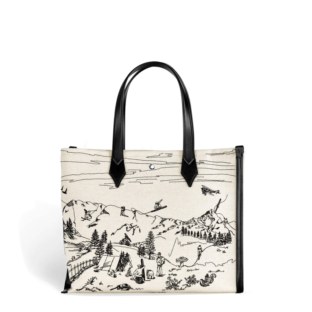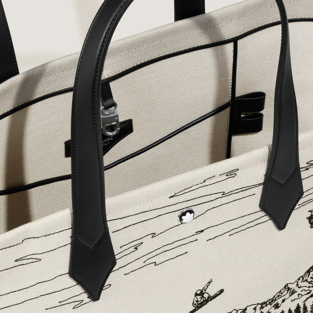 Diese Tasche für die Stadt aus elegantem elfenbeinfarbenem Canvas mit zarter Stickerei in Schwarz schützt Ihre Habseligkeiten mit einem eleganten Hakenverschluss. Die Vorderseite ist mit dem Montblanc Emblem verziert, das von einem palladiertem Ring umgeben ist und einen Hauch von Luxus verströmt. Im Inneren ist das Hauptfach mit Reißverschlusstaschen, zwei offenen Taschen und einer Schreibgerätehalterung durchdacht organisiert. Eine Lederschlaufe für Schlüssel oder kleine Accessoires ist ebenfalls enthalten, so dass alles seinen Platz hat.