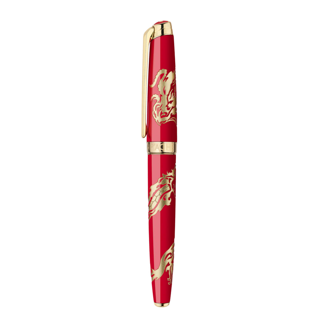 Der Drache und die Metallteile wie der Clip, der Knopf und die Schaftspitze von Füllfederhalter und Rollerball sind mit 18-karätigem Gold überzogen und bilden einen leuchtenden Kontrast zum glanzvoll funkelnden roten Lack.