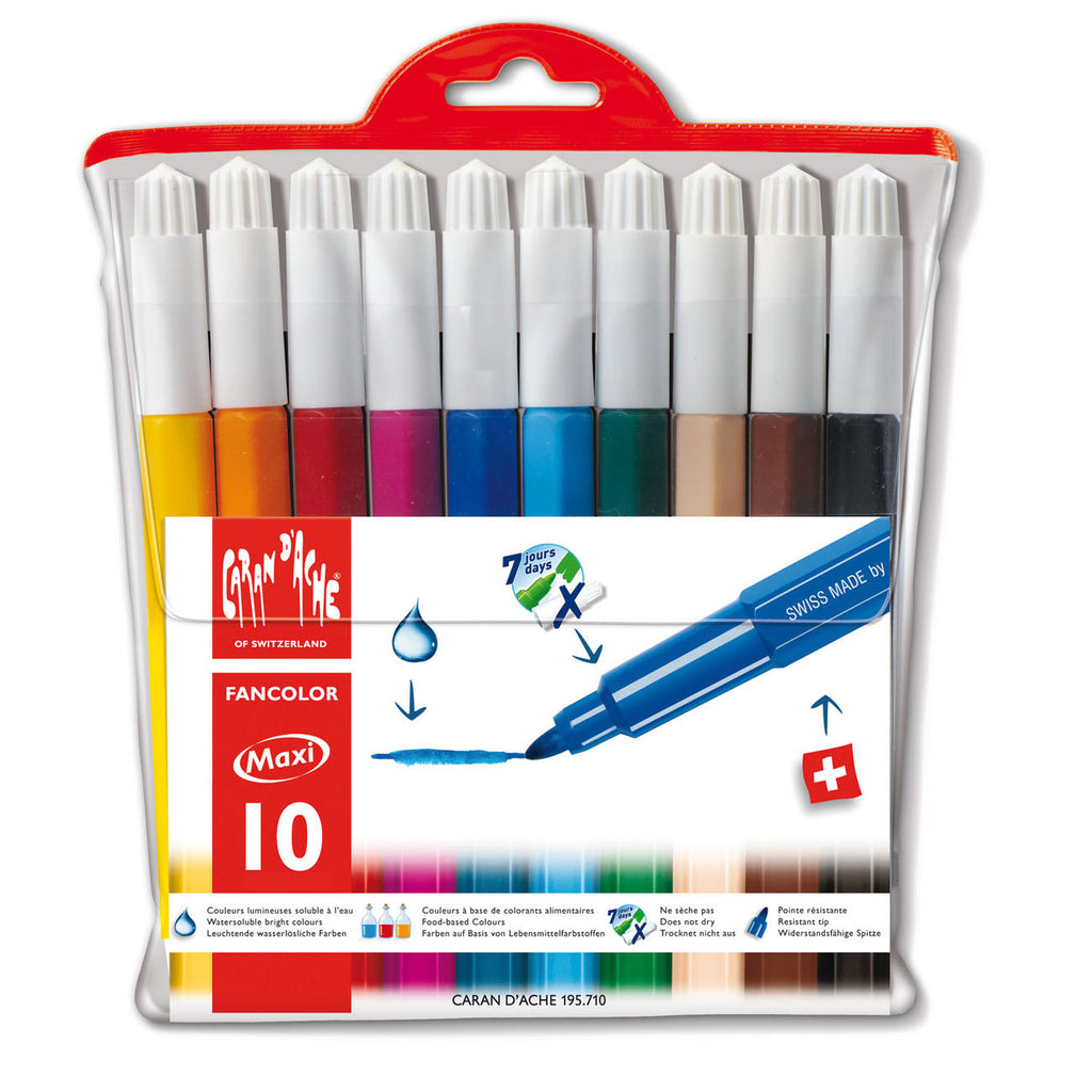 Die Fasermalstifte FANCOLOR MAXI von Caran d'Ache sind für die ersten Malversuche und das Ausmalen von Malvorlagen bestens geeignet. Sie sind aufgrund ihrer Größe und ihres Durchmessers ideal für kleine Hände. Toll: Sie sind aquarellierbar und trocknen bei offener Kappe bis zu 7 Tagen nicht aus. Das hat unser Lob verdient.