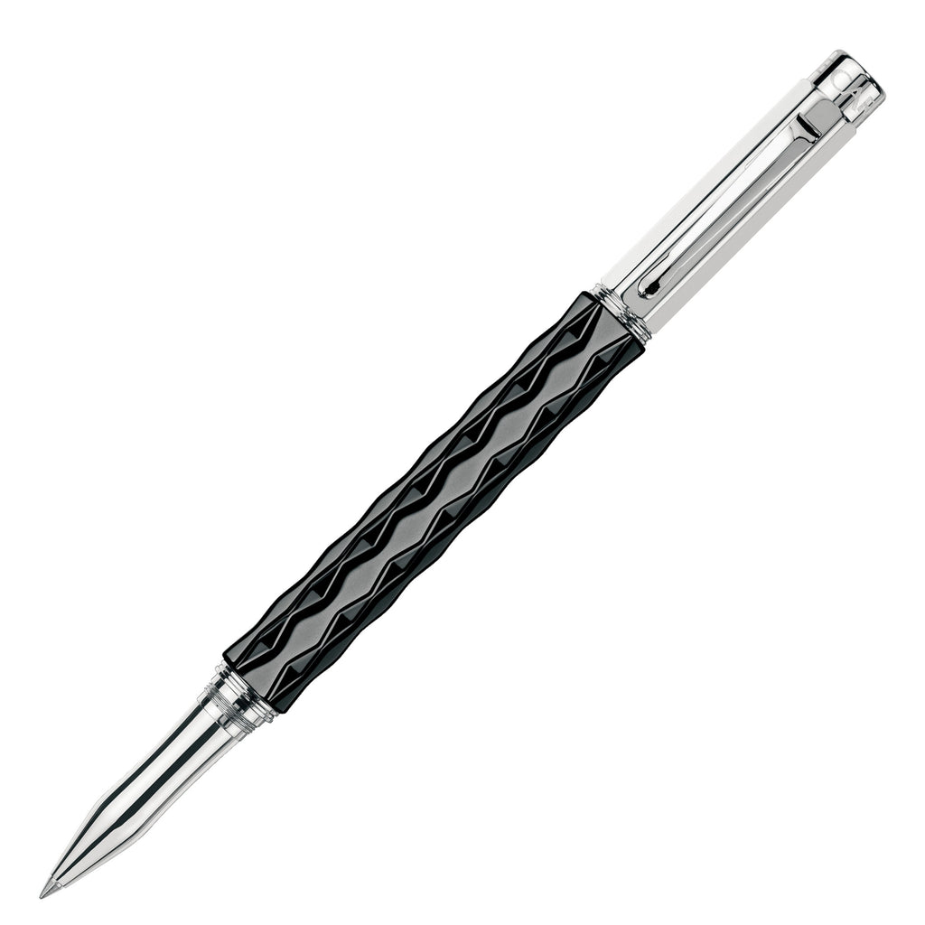Die schwarze Keramik wird präzise geschliffen, auf Hochglanz poliert und lässt den Schreibgerätekörper bildhauerisch wirken. Die Farbe der Oberfläche verändert sich je nach Lichteinfall vom tiefen Schwarz ins leichte Anthrazit und entwickelt eine ungeheure Brillianz. Die Kollektion umfasst Füllfederhalter, Tintenroller, Kugelschreiber und Minenhalter.