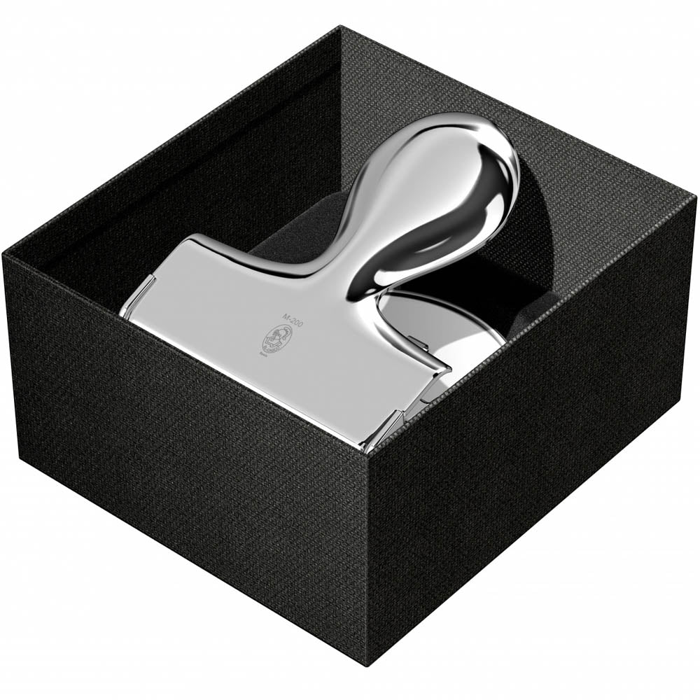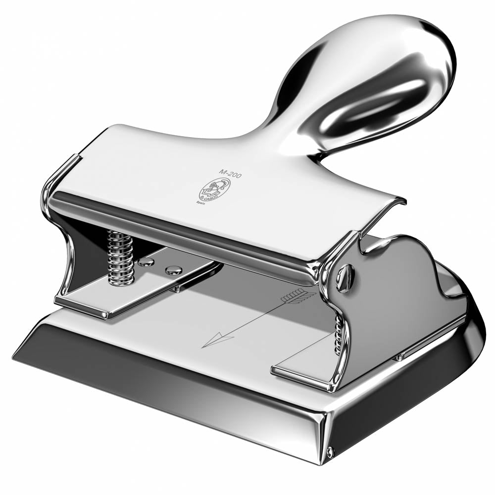 Alle Bestandteile dieser Lochmaschinen sind exakt aufeinander eingestellt, von Hand fein justiert und mit fortlaufenden Seriennummern versehen. Diese garantieren die Originalität eines jeden EL CASCO EDELCHROM Produktes. Zum Schluss werden die eleganten Alltagshelfer per Hand auf Hochglanz gebracht. und so wird gelocht: Zum Lochen dient die Mittelmarkierung auf der Bodenplatte, die in Form eines Pfeiles in das Material eingraviert ist. Die Stanzkapazität beträgt 30 Blatt Papier. Beim einfachen Öffnen und Entleeren des Sammelfaches für das Konfetti hilft eine Metallfeder in der Bodenplatte. Auf die Anschlagschiene für die unterschiedlichen Papierformate wurde bei diesem Locher bewusst verzichtet.