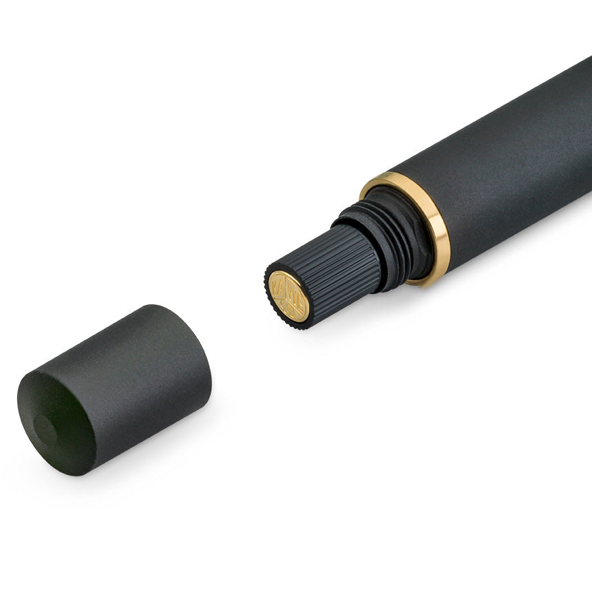 Die matt anodisierte Oberfläche des robusten Aluminiumgehäuses ist äußerst widerstandsfähig und verleiht dem Stift eine hochwertige Haptik. Die perfekte Ausgewogenheit zwischen Gewicht und Durchmesser des Füllhalters sorgt zudem dafür, dass die Hand selbst nach langen Schreibperioden nicht ermüdet. Durch die Kombination mit goldenen Zierelementen wird die Funktionalität mit stilsicherer Eleganz erweitert und vereint damit traditionelle Füllmethoden mit dem modernen Zeitalter.