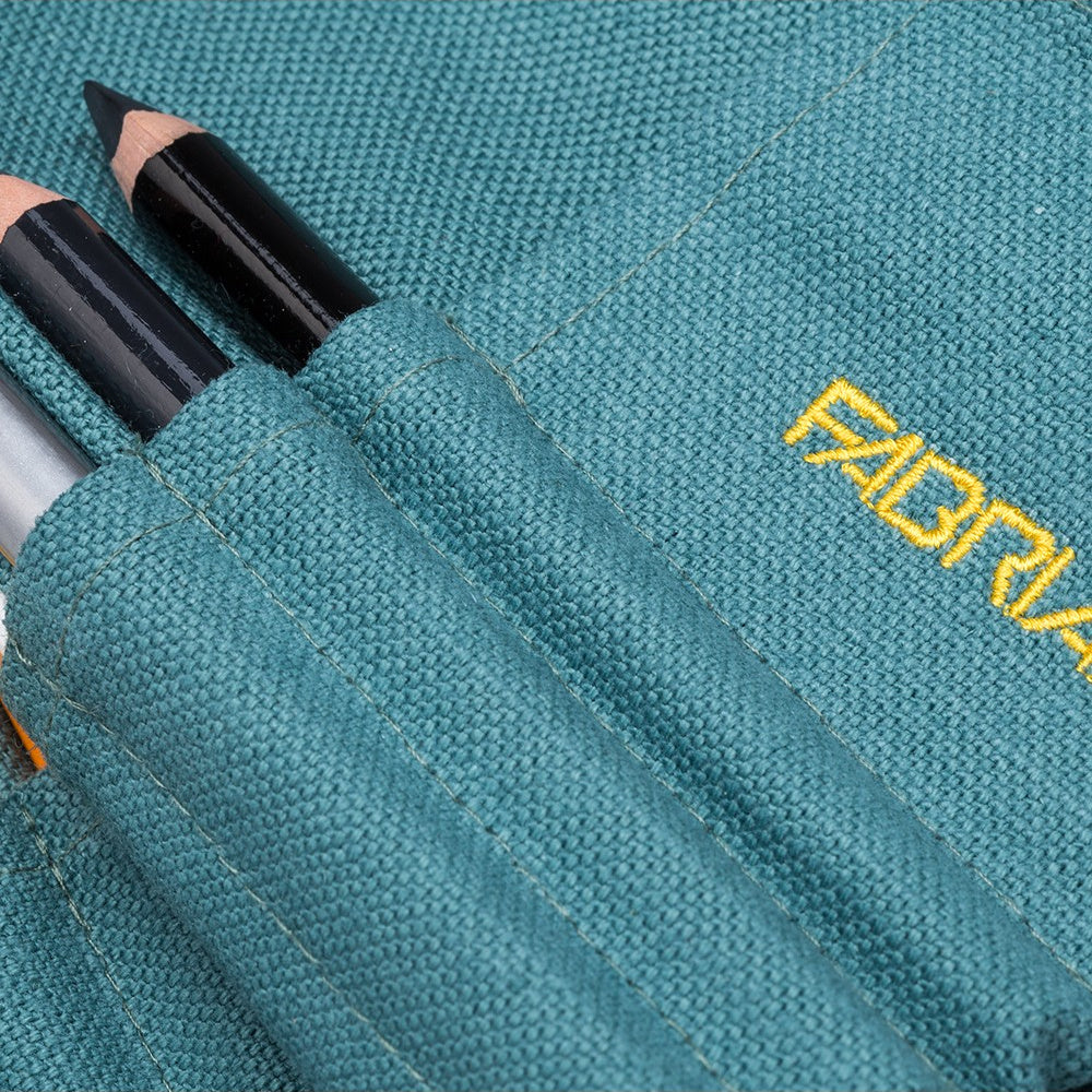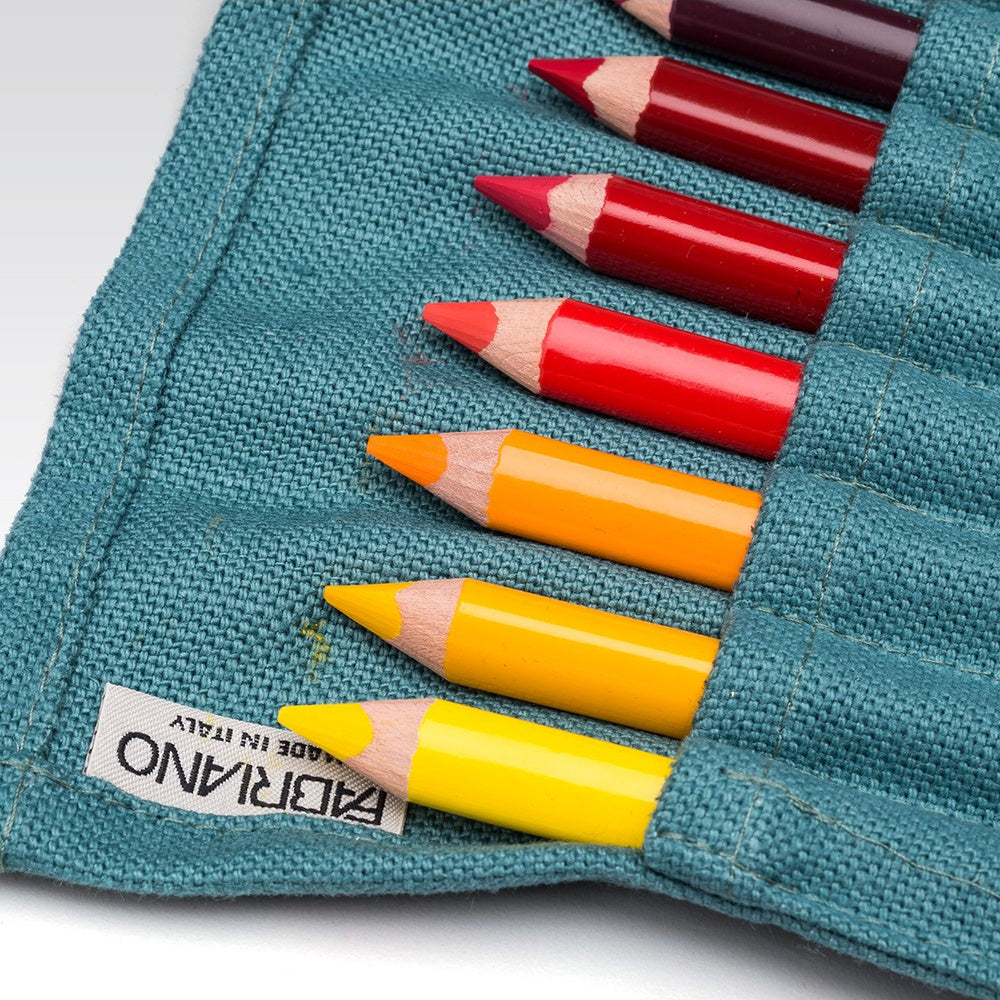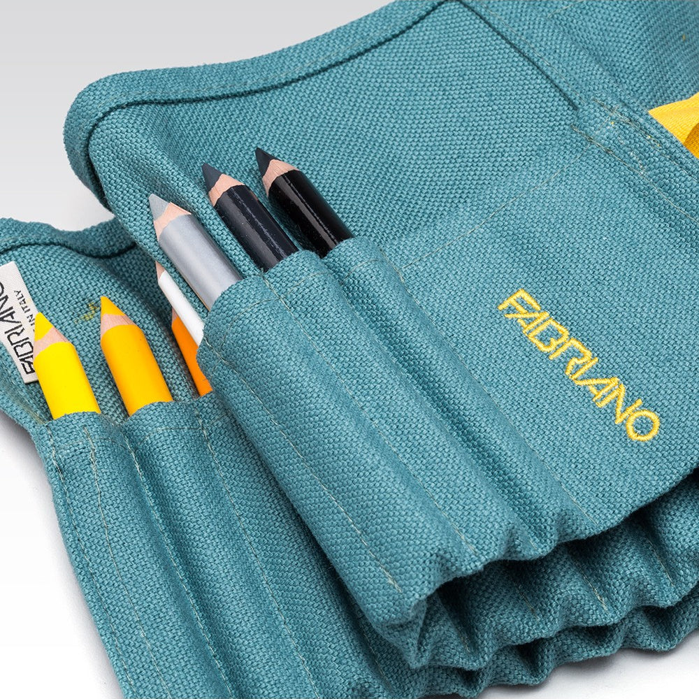Die italienische Firma Fabriano ist bekannt für ihre Farbstifte und die fröhlich leuchtenden Farben ihrer gesamten Künstler-, Leder- und Accessoires-Kollektion. So kommt denn auch diese Stiftrolle in herrlichen Farbtönen, mit 24 Stiftgaragen, die mit Farbstiften gefüllt sind. Die Stifterolle ist aus festem, robustem Segeltuch. Die Farbstifte haben einen dreikantiger, etwas dickeren Körper und sind hochpigmentiert.