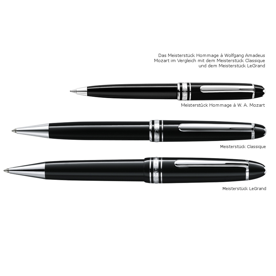 Dieser Klassiker der Schreibgeräte präsentiert sich heute in zwei Produktfamilien: dem edel-schlanken Meisterstück "Classique" und dem voluminös-gewichtigen "LeGrand de Montblanc". Zu beiden gesellen sich passend Kugelschreiber, Rollerball und Drehbleistift. Als praktischen Reisebegleiter führte MONTBLANC darüber hinaus mit dem "LeGrand Traveller" einen Füllfederhalter mit Patronenschlitten ein. Noch größer und gewichtiger gibt sich das eigentliche Herzstück der gesamten Kollektion, das "MEISTERSTÜCK 149" - der Füllfederhalter, der weltweit Verträge besiegelt und in der Hand von Staatsmännern bereits Geschichte schrieb. Nicht jeder mag es groß. Auch daran hat MONTBLANC gedacht. Als kleinste Variante dieser Produktfamilie präsentiert sich das MEISTERSTÜCK "Hommage à W.A. Mozart".