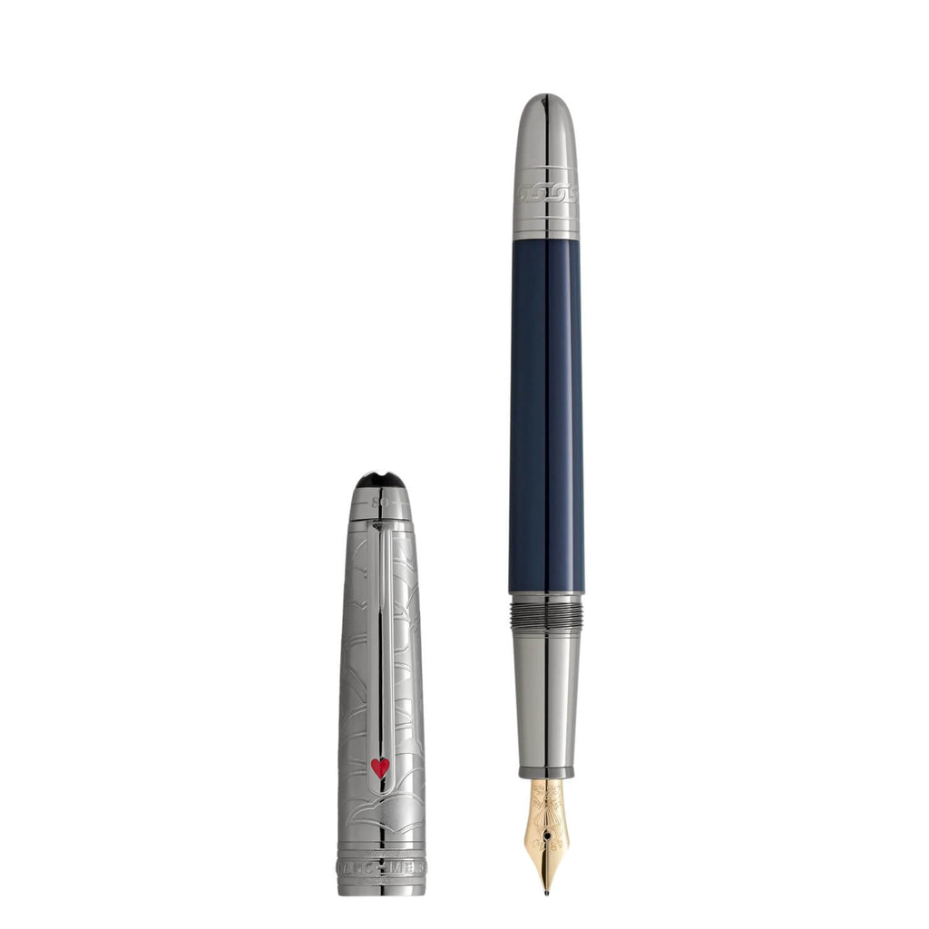 Tauchen Sie ein in die raffinierten Details – ein elegant auf die Kappe gelaserter Zug, ein Sicherheitskettenmuster auf dem Konus, das einen entscheidenden Moment widerspiegelt, in dem Passepartout den Zug von der Lokomotive abkoppelt, um die von den Sioux angegriffene Besatzung zu retten. Das Design der Kappe fängt Druckventile und den aufsteigenden Rauch der Lokomotive ein, während der Clip mit einem rot lackierten Herz die Verbindung zwischen Phileas Fogg und Prinzessin Aouda symbolisiert. Außerdem stehen die Kartenfarben für Foggs gewagte Wette, die Reise in nur 80 Tagen zu bewältigen. Auf dem Kappenkopf ist die Zeitachse der Reise eingeprägt – 36 Tage von Yokohama nach London, insgesamt glanzvolle 80 Tage um die Welt. Dieses Schreibgerät wird durch eine handgefertigte Feder aus 18K Gold aufgewertet, die mit 14/11 und 21/12 markiert ist – eine Erinnerung an Mr. Foggs Abreise aus Yokohama am 14. November und seinen ehrgeizigen Plan, bis zum 21. Dezember in den Londoner Club zurückzukehren, um die Wette zu gewinnen. Es ist auch mit der Darstellung eines Heißluftballons verziert, eine Anspielung auf Jules Vernes ersten Abenteuerroman.