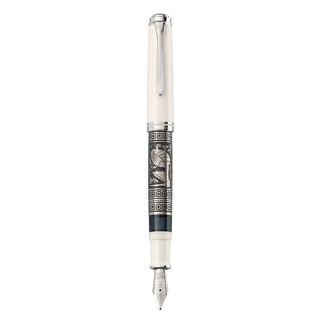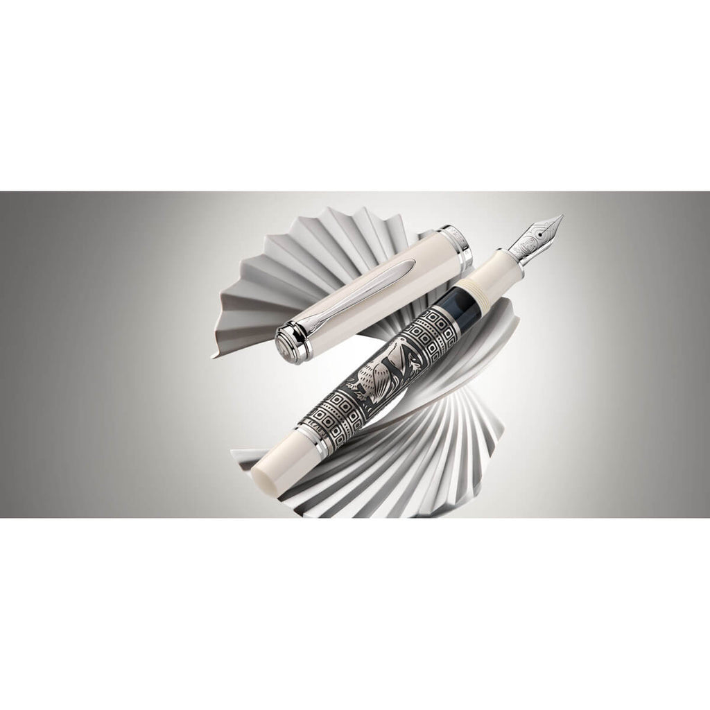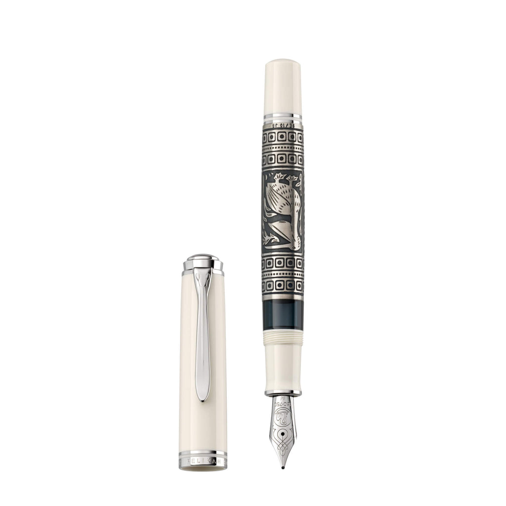 Die Kunst des Damaszierens ist eine jahrtausendealte Handwerkskunst auf höchstem Niveau. Die neue Special Edition Toledo M910 White zelebriert diese besondere Handwerkskunst. Das größte Highlight dieser Edition ist der dekorative Schaft. In mehreren aufwändigen Arbeitsschritten wird das detaillierte Pelikanmotiv auf dem Schaft veredelt. Das besondere Pelikanmotiv wird von einem Goldschmied von Hand veredelt. Der umlaufende Korpus aus 925er Sterlingsilber zeigt zwei Pelikanmotive: einen kleinen Pelikan, der vor einem Pelikan mit ausgebreiteten Flügeln steht, und einen Pelikan mit offenem Schnabel. Beide Motive werden von Ornamenten eingerahmt. Während des Herstellungsprozesses wird das Motiv auf die Hülse geätzt und dann werden die filigranen Details von Hand gestichelt. Schließlich wird die Oberfläche des Korpus mit Palladium beschichtet. Der Füllfederhalter hat eine Feder aus 18-Karat/750er Gold, die vollständig rhodiniert ist. Jedes Toledo Schreibgerät ist ein Unikat und wird in Deutschland handgefertigt. Der Toledo M910 White ist nur für eine begrenzte Zeit erhältlich und wird in einer hochwertigen, weiß klavierlackierten Toledo Geschenkbox geliefert.