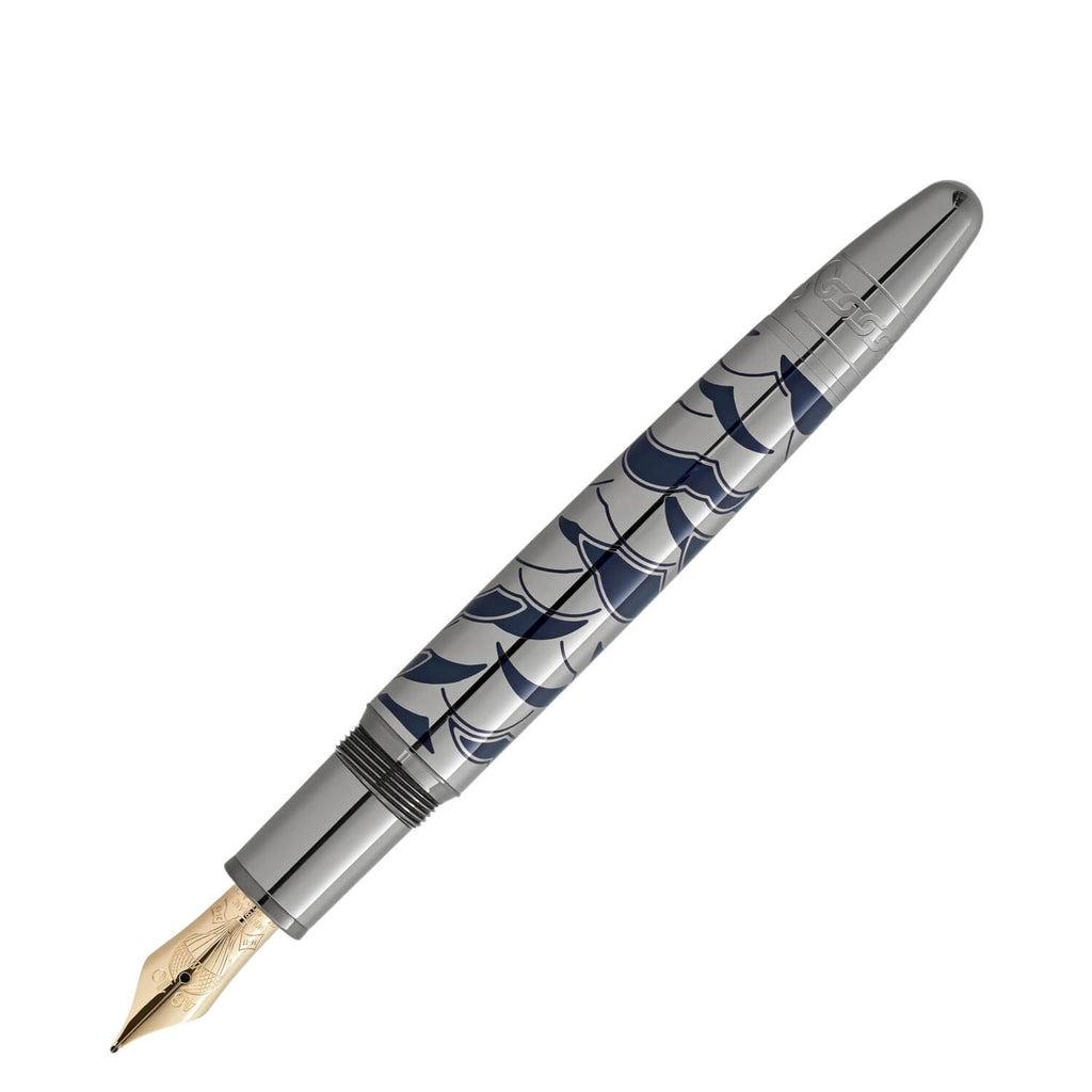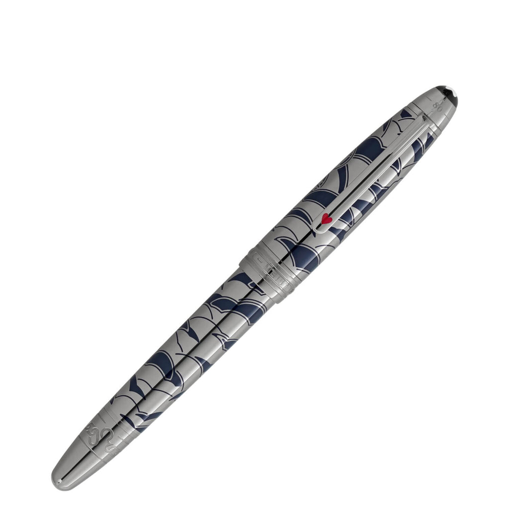 Tauchen Sie ein in die raffinierten Details – ein elegant auf die Kappe gelaserter Zug, ein Sicherheitskettenmuster auf dem Konus, das einen entscheidenden Moment widerspiegelt, in dem Passepartout den Zug von der Lokomotive abkoppelt, um die von den Sioux angegriffene Besatzung zu retten. Das Design von Kappe und Korpus fängt Druckventile und den aufsteigenden Rauch der Lokomotive ein, während der Clip mit einem rot lackierten Herz die Verbindung zwischen Phileas Fogg und Prinzessin Aouda symbolisiert. Außerdem stehen die Kartenfarben für Foggs gewagte Wette, die Reise in nur 80 Tagen zu bewältigen. Auf dem Kappenkopf ist die Zeitachse der Reise eingeprägt – 36 Tage von Yokohama nach London, insgesamt glanzvolle 80 Tage um die Welt. Dieses Schreibgerät wird durch eine handgefertigte Feder aus 18K Gold aufgewertet, die mit 14/11 und 21/12 markiert ist – eine Erinnerung an Mr. Foggs Abreise aus Yokohama am 14. November und seinen ehrgeizigen Plan, bis zum 21. Dezember in den Londoner Club zurückzukehren, um die Wette zu gewinnen. Es ist auch mit der Darstellung eines Heißluftballons verziert, eine Anspielung auf Jules Vernes ersten Abenteuerroman.