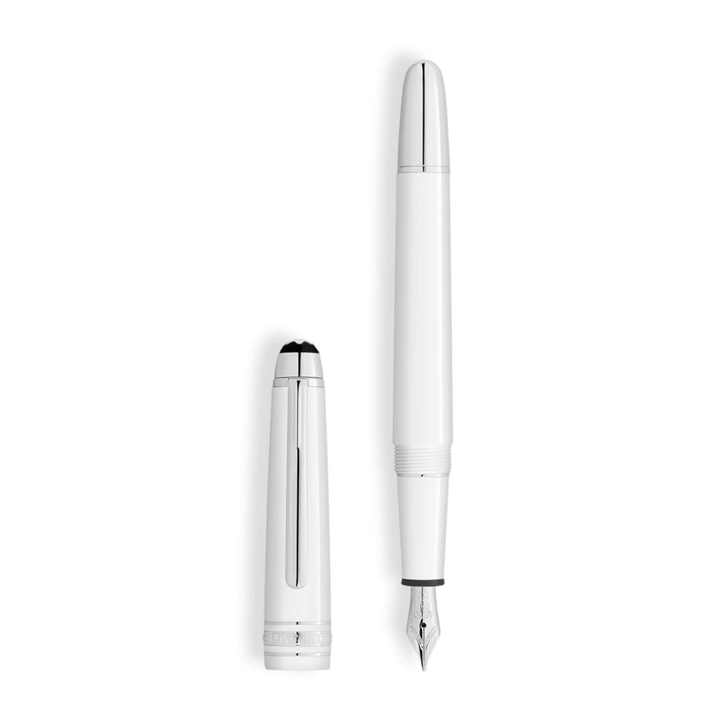 Der Meisterstück Classique Füllfederhalter aus weißem Edelharz mit eleganten platinbeschichteten Beschlägen und dem weißen Montblanc Emblem auf der Kappe entwickelt sich zu einer unverwechselbaren Designikone.